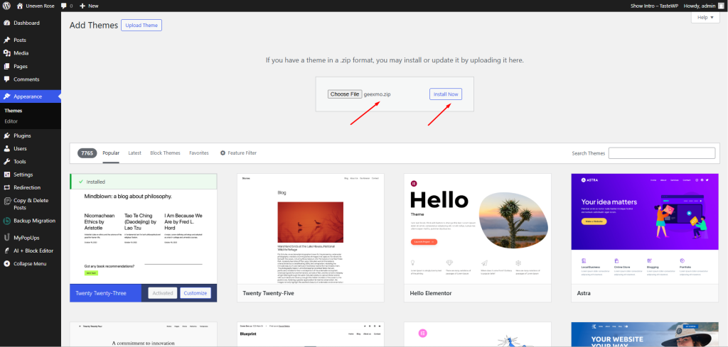Note: When uploading your theme with the installer, please ensure you are uploading the theme .zip file, not the entire package you downloaded. In this case, you will be uploading geexmo.zip