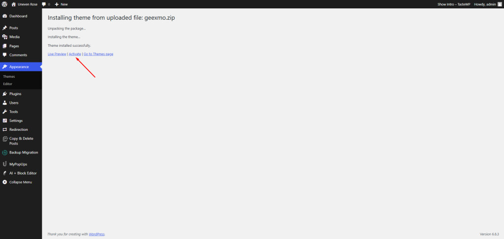 Once uploaded, activate the theme by heading to the “Themes” menu in the WordPress Dashboard. Locate the geexmo theme and hit “Activate”.